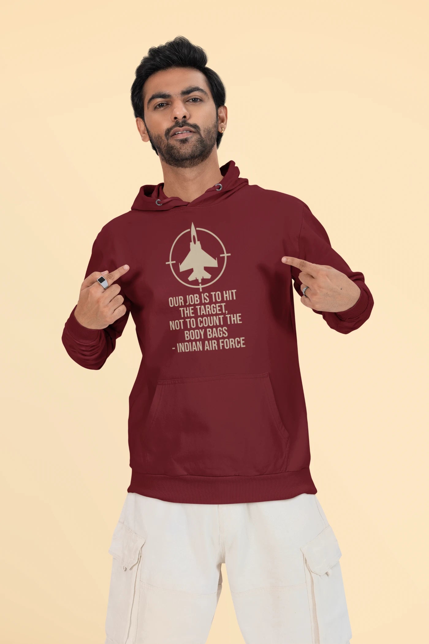 Stand with courage, precision, and purpose in the Our Job Is to Hit the Target, Not to Count the Body Bags IAF Unisex Hoodie from Lazy Llama. This powerful piece from the Operation Sindoor collection is a bold tribute to the fearless spirit of the Indian Air Force, designed for those who respect action over words.